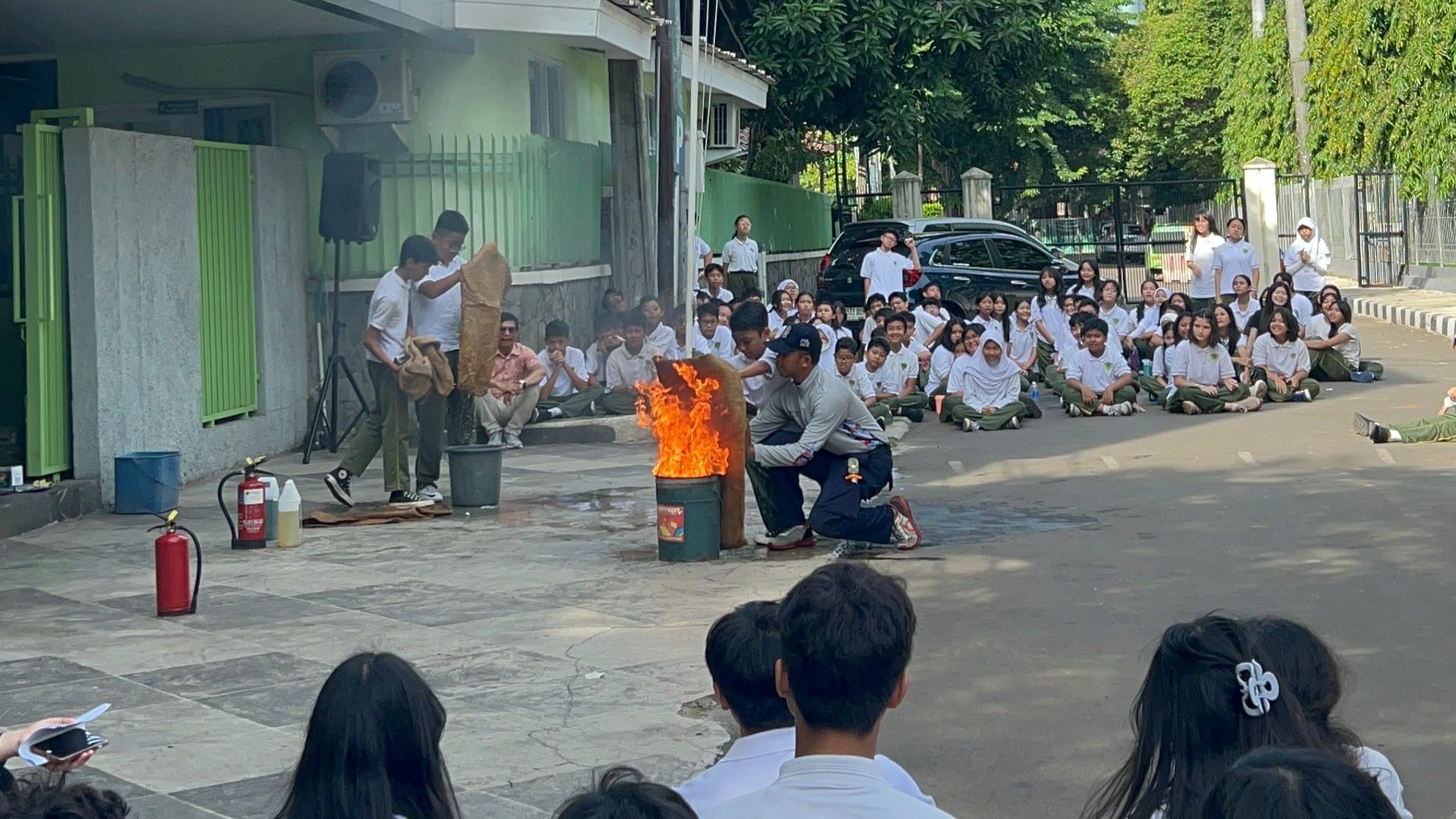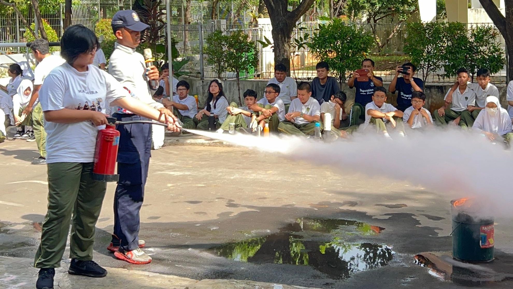 Acara dimulai dengan penyuluhan dari tim Damkar yang menjelaskan penyebab umum kebakaran, pentingnya mengenali alat pemadam api ringan (APAR), serta prosedur evakuasi yang aman. Penyuluhan ini disampaikan dengan cara yang interaktif sehingga mudah dipahami oleh siswa. Setelah sesi teori, siswa diajak mengikuti simulasi evakuasi. Dalam simulasi ini, mereka berlatih bergerak dengan tenang menuju titik kumpul yang telah ditentukan sambil mematuhi arahan dari tim Damkar. Selain itu, siswa juga diberi kesempatan mencoba menggunakan APAR untuk memadamkan api kecil di bawah pengawasan petugas.